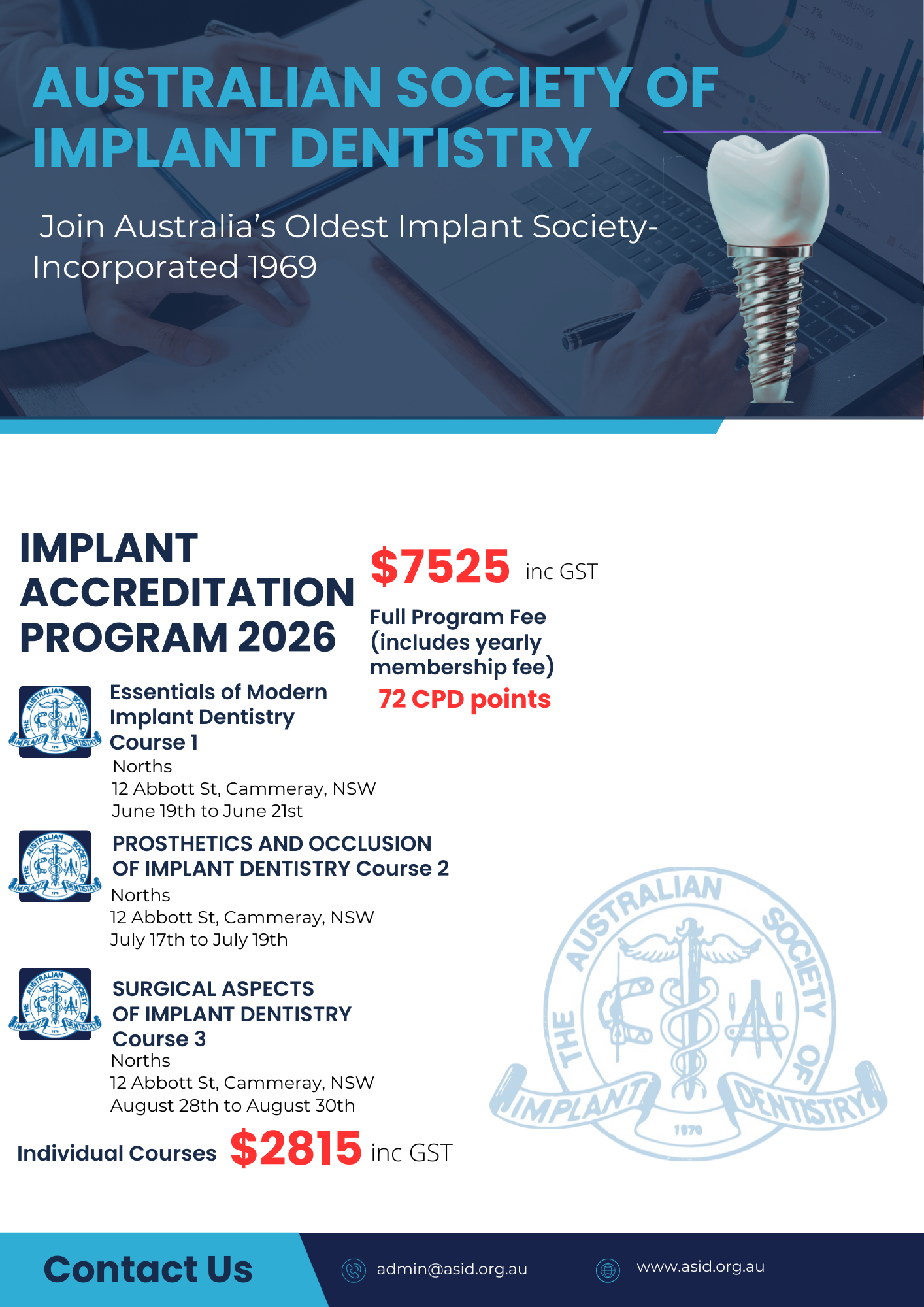 ASID members receive regular mail outs. Automatic affiliated membership with ICOI (International Congress of Implantology) and online access to the ICOI journals. Discounts on ASID courses and accreditation/fellowship and assistance to attain Diplomat status with ICOI.