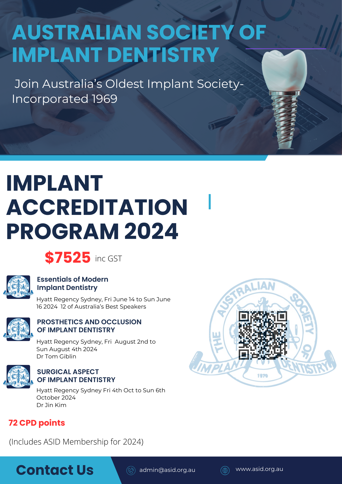ASID Accreditation program for 2024. Includeds Fundamentals of Implant Dentistry Prosthetics and Occlusion in Implant Dentistry Surgical Aspects of Implant Dentistry