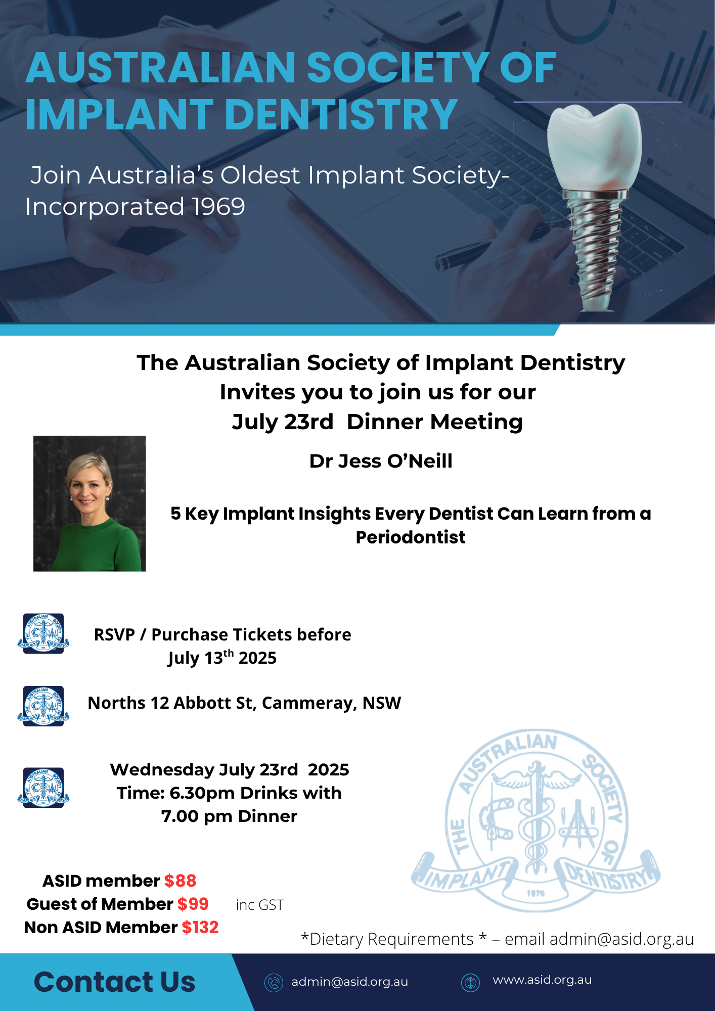 Our July Dinner Meeting is approaching soon. Our speaker for the evening is Periodontist Dr Jess O'Neill